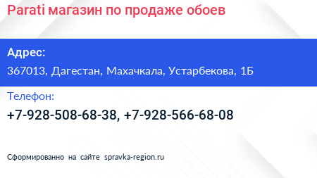 Parati, магазин по продаже обоев по адресу 367013, Дагестан, Махачкала, Устарбекова, 1Б в дальнейшем Организация, размещена в следующих категориях: