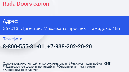 Rada Doors, салон по адресу 367013, Дагестан, Махачкала, проспект Гамидова, 18а в дальнейшем Организация, размещена в следующих категориях: