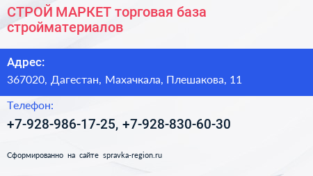 СТРОЙ МАРКЕТ, торговая база стройматериалов по адресу 367020, Дагестан, Махачкала, Плешакова, 11 в дальнейшем Организация, размещена в следующих категориях: