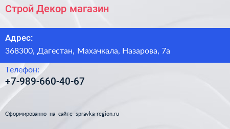 Строй Декор, магазин по адресу 368300, Дагестан, Махачкала, Назарова, 7а в дальнейшем Организация, размещена в следующих категориях: