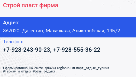 Строй пласт, фирма по адресу 367020, Дагестан, Махачкала, Аликолобская, 14Б/2 в дальнейшем Организация, размещена в следующих категориях: