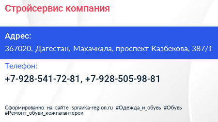 Стройсервис, компания по адресу 367020, Дагестан, Махачкала, проспект Казбекова, 387/1 в дальнейшем Организация, размещена в следующих категориях: