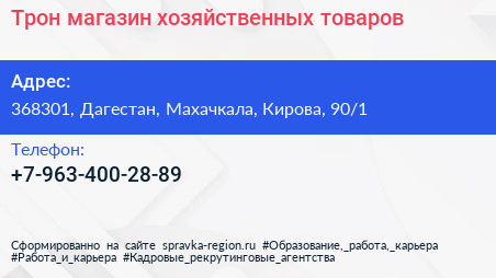 Трон, магазин хозяйственных товаров по адресу 368301, Дагестан, Махачкала, Кирова, 90/1 в дальнейшем Организация, размещена в следующих категориях:
