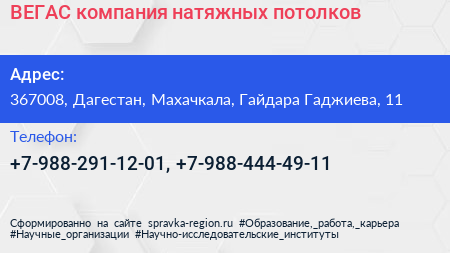ВЕГАС, компания натяжных потолков по адресу 367008, Дагестан, Махачкала, Гайдара Гаджиева, 11 в дальнейшем Организация, размещена в следующих категориях:
