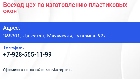 Восход, цех по изготовлению пластиковых окон по адресу 368301, Дагестан, Махачкала, Гагарина, 92а в дальнейшем Организация, размещена в следующих категориях: