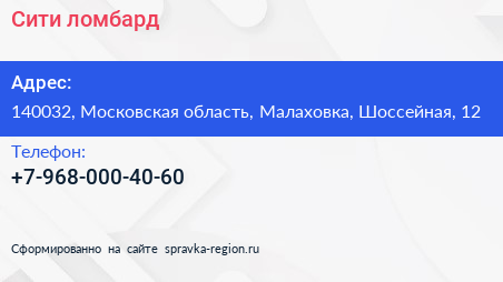 Сити, ломбард по адресу 140032, Московская область, Малаховка, Шоссейная, 12 в дальнейшем Организация, размещена в следующих категориях: