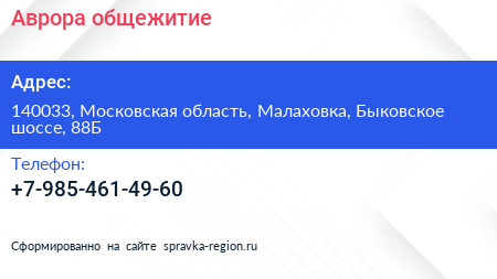 Аврора, общежитие по адресу 140033, Московская область, Малаховка, Быковское шоссе, 88Б в дальнейшем Организация, размещена в следующих категориях: