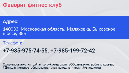 Фаворит, фитнес-клуб по адресу 140033, Московская область, Малаховка, Быковское шоссе, 88Б в дальнейшем Организация, размещена в следующих категориях: