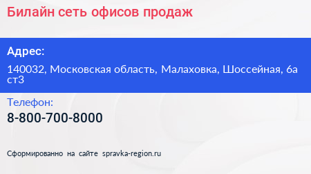 Билайн, сеть офисов продаж по адресу 140032, Московская область, Малаховка, Шоссейная, 6а ст3 в дальнейшем Организация, размещена в следующих категориях: