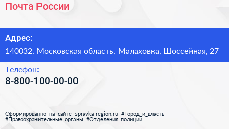 Почта России по адресу 140032, Московская область, Малаховка, Шоссейная, 27 в дальнейшем Организация, размещена в следующих категориях: