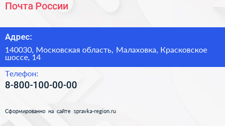 Почта России по адресу 140030, Московская область, Малаховка, Красковское шоссе, 14 в дальнейшем Организация, размещена в следующих категориях: