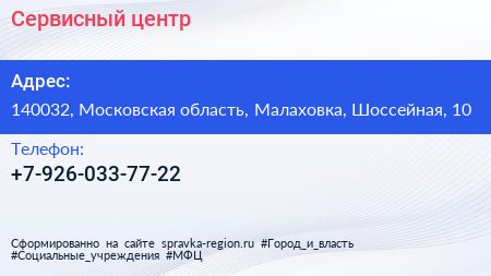 Сервисный центр по адресу 140032, Московская область, Малаховка, Шоссейная, 10 в дальнейшем Организация, размещена в следующих категориях: