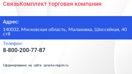 СвязьКомплект, торговая компания по адресу 140032, Московская область, Малаховка, Шоссейная, 40 ст8 в дальнейшем Организация, размещена в следующих категориях: