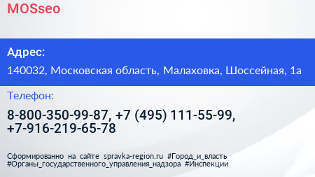 MOSseo по адресу 140032, Московская область, Малаховка, Шоссейная, 1а в дальнейшем Организация, размещена в следующих категориях: