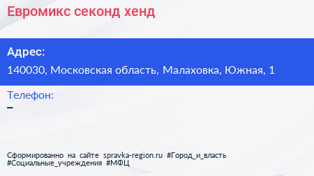 Евромикс, секонд-хенд по адресу 140030, Московская область, Малаховка, Южная, 1 в дальнейшем Организация, размещена в следующих категориях: