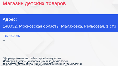 Магазин детских товаров по адресу 140032, Московская область, Малаховка, Рельсовая, 1 ст3 в дальнейшем Организация, размещена в следующих категориях: