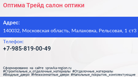 Оптима Трейд, салон оптики по адресу 140032, Московская область, Малаховка, Рельсовая, 1 ст3 в дальнейшем Организация, размещена в следующих категориях: