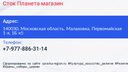 Сток Планета, магазин по адресу 140030, Московская область, Малаховка, Первомайская 1-я, 1Б к5 в дальнейшем Организация, размещена в следующих категориях:
