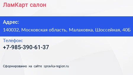 ЛамКарт, салон по адресу 140032, Московская область, Малаховка, Шоссейная, 40Б в дальнейшем Организация, размещена в следующих категориях: