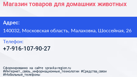 Магазин товаров для домашних животных по адресу 140032, Московская область, Малаховка, Шоссейная, 26 в дальнейшем Организация, размещена в следующих категориях: