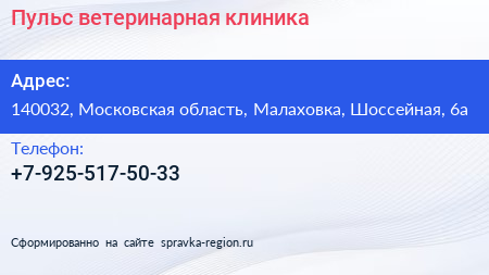 Пульс, ветеринарная клиника по адресу 140032, Московская область, Малаховка, Шоссейная, 6а в дальнейшем Организация, размещена в следующих категориях: