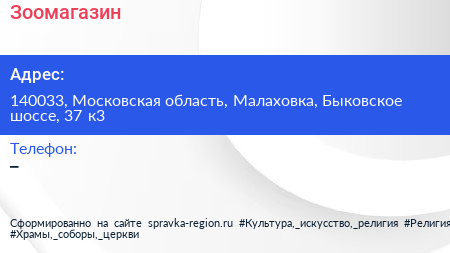 Зоомагазин по адресу 140033, Московская область, Малаховка, Быковское шоссе, 37 к3 в дальнейшем Организация, размещена в следующих категориях: