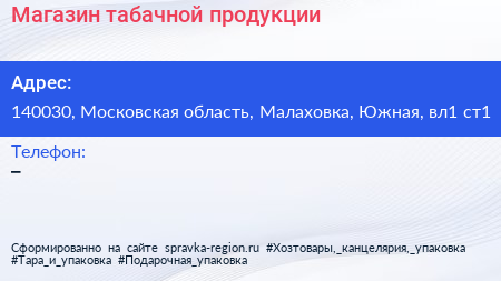 Магазин табачной продукции по адресу 140030, Московская область, Малаховка, Южная, вл1 ст1 в дальнейшем Организация, размещена в следующих категориях: