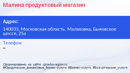 Малина, продуктовый магазин по адресу 140033, Московская область, Малаховка, Быковское шоссе, 25а в дальнейшем Организация, размещена в следующих категориях: