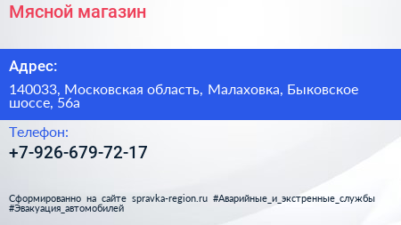 Мясной магазин по адресу 140033, Московская область, Малаховка, Быковское шоссе, 56а в дальнейшем Организация, размещена в следующих категориях: