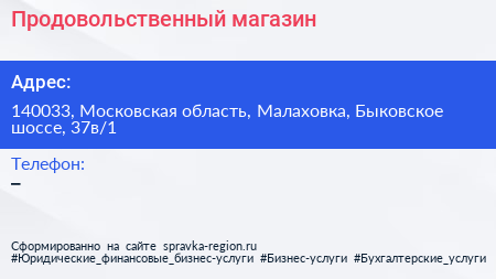 Продовольственный магазин по адресу 140033, Московская область, Малаховка, Быковское шоссе, 37в/1 в дальнейшем Организация, размещена в следующих категориях:
