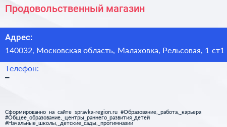 Продовольственный магазин по адресу 140032, Московская область, Малаховка, Рельсовая, 1 ст1 в дальнейшем Организация, размещена в следующих категориях: