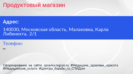 Продуктовый магазин по адресу 140030, Московская область, Малаховка, Карла Либкнехта, 2/1 в дальнейшем Организация, размещена в следующих категориях: