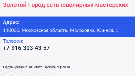 Золотой Город, сеть ювелирных мастерских по адресу 140030, Московская область, Малаховка, Южная, 1 в дальнейшем Организация, размещена в следующих категориях: