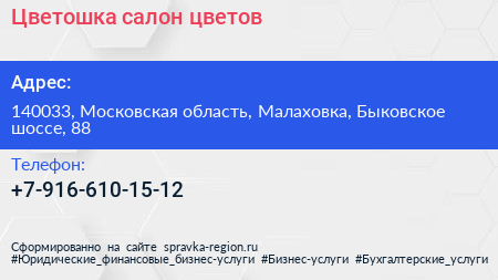 Цветошка, салон цветов по адресу 140033, Московская область, Малаховка, Быковское шоссе, 88 в дальнейшем Организация, размещена в следующих категориях: