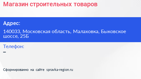 Магазин строительных товаров по адресу 140033, Московская область, Малаховка, Быковское шоссе, 25Б в дальнейшем Организация, размещена в следующих категориях: