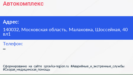 Автокомплекс по адресу 140032, Московская область, Малаховка, Шоссейная, 40 вл1 в дальнейшем Организация, размещена в следующих категориях: