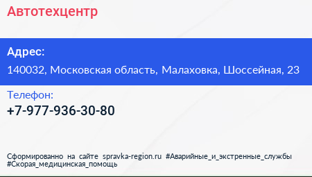 Автотехцентр по адресу 140032, Московская область, Малаховка, Шоссейная, 23 в дальнейшем Организация, размещена в следующих категориях: