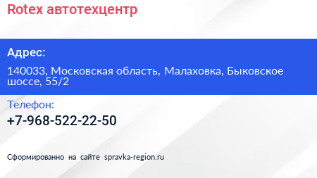 Rotex, автотехцентр по адресу 140033, Московская область, Малаховка, Быковское шоссе, 55/2 в дальнейшем Организация, размещена в следующих категориях:
