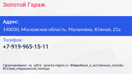 Золотой Гараж по адресу 140030, Московская область, Малаховка, Южная, 21а в дальнейшем Организация, размещена в следующих категориях: