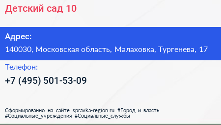 Детский сад №10 по адресу 140030, Московская область, Малаховка, Тургенева, 17 в дальнейшем Организация, размещена в следующих категориях: