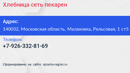 Хлебница, сеть пекарен по адресу 140032, Московская область, Малаховка, Рельсовая, 1 ст5 в дальнейшем Организация, размещена в следующих категориях: