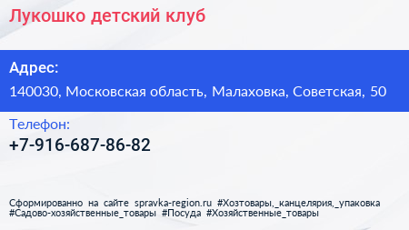 Лукошко, детский клуб по адресу 140030, Московская область, Малаховка, Советская, 50 в дальнейшем Организация, размещена в следующих категориях:
