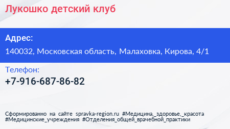 Лукошко, детский клуб по адресу 140032, Московская область, Малаховка, Кирова, 4/1 в дальнейшем Организация, размещена в следующих категориях: