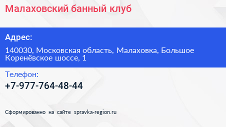 Малаховский банный клуб по адресу 140030, Московская область, Малаховка, Большое Коренёвское шоссе, 1 в дальнейшем Организация, размещена в следующих категориях: