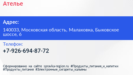 Ателье по адресу 140033, Московская область, Малаховка, Быковское шоссе, 6 в дальнейшем Организация, размещена в следующих категориях: