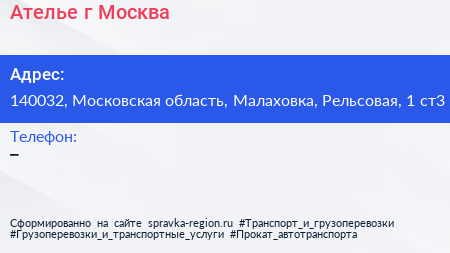 Ателье, г. Москва по адресу 140032, Московская область, Малаховка, Рельсовая, 1 ст3 в дальнейшем Организация, размещена в следующих категориях: