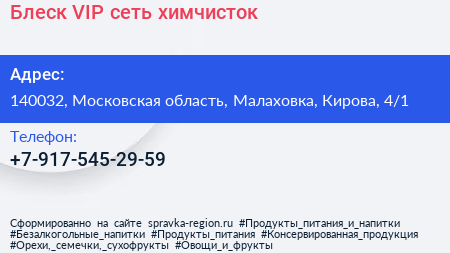 Блеск VIP, сеть химчисток по адресу 140032, Московская область, Малаховка, Кирова, 4/1 в дальнейшем Организация, размещена в следующих категориях: