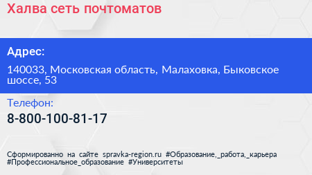 Халва, сеть почтоматов по адресу 140033, Московская область, Малаховка, Быковское шоссе, 53 в дальнейшем Организация, размещена в следующих категориях:
