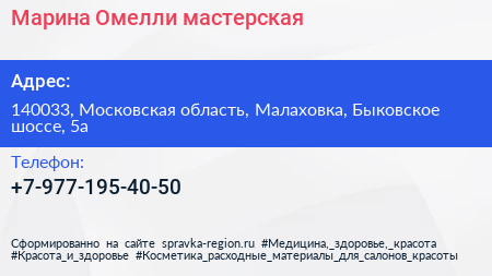 Марина Омелли, мастерская по адресу 140033, Московская область, Малаховка, Быковское шоссе, 5а в дальнейшем Организация, размещена в следующих категориях: