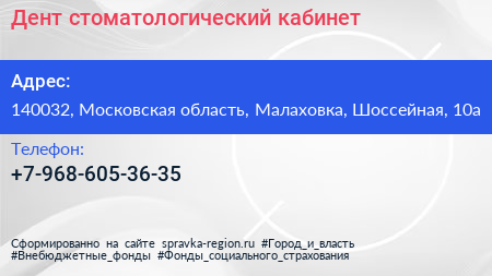Дент, стоматологический кабинет по адресу 140032, Московская область, Малаховка, Шоссейная, 10а в дальнейшем Организация, размещена в следующих категориях: